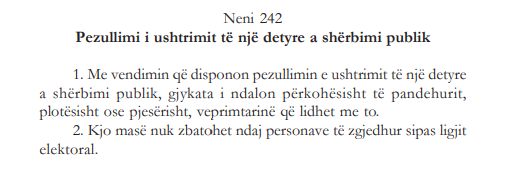 Pra, ligji përjashton vetëm ata që janë zgjedhur me votë nga populli siç janë deputetët dhe kryetarët e bashkive, të cilët nuk mund të pezullohen nga gjykatat. Balluku është marrë e pandehur nga SPAK e akuzuar për “shkelje të barazisë në tendera” në rastin e tunelit të Llogarasë dhe në tenderimin e lotit 4 të Unazës së Madhe të Tiranës.
