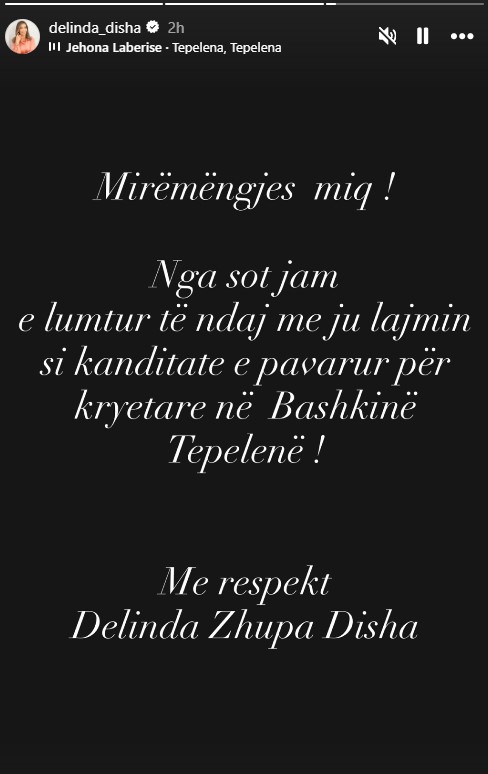 “Mirëmëngjes miq! Nga sot jam e lumtur të ndaj me ju lajmin si kandidate e pavarur për kryetare në Bashkinë Tepelenë! Me respekt, Delinda Zhupa Disha”, shkroi Disha në një postim në Instagram Story.
