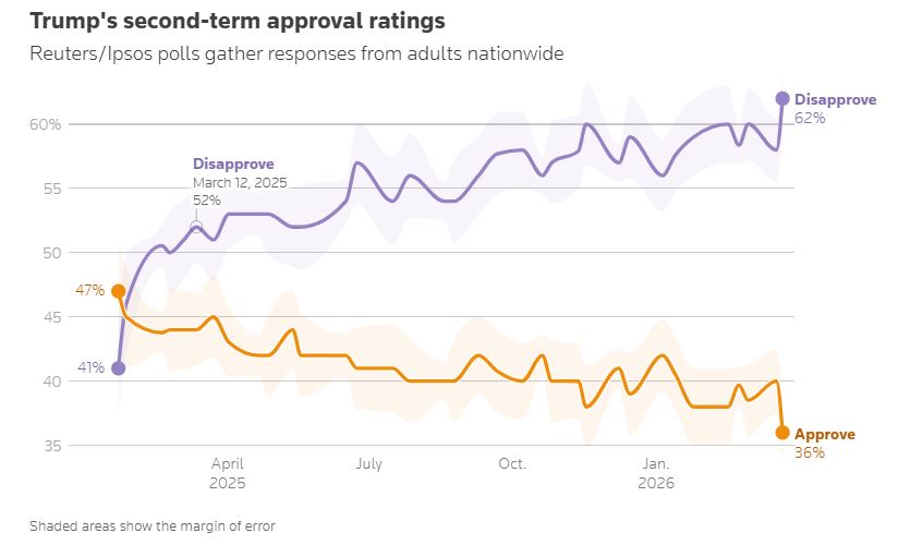 Sondazhi 4-ditor, i cili përfundoi dje, tregoi se vetëm 36% e amerikanëve miratojnë performancën e Trump që nga fillimi i mandatit të tij të dytë si president, një përqindje që ka rënë me 4 pikë krahasuar me një sondazh të javës së kaluar (40%).