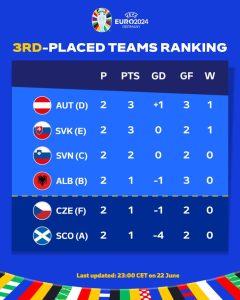 Euro 2024 përfundoi të shtunën në mbrëmje raundin e dytë të fazës në grupe, me 24 skuadrat të cilat përgatiten të luajnë edhe xhiron e fundit përpara se të mësojnë fatin e tyre. Në fazën e eliminimeve direkte kalojnë 16 skuadra, që do të thotë dy vendet e para të të gjashtë grupeve, si dhe katër vendet e treta më të mira nga gjashtë grupet.
