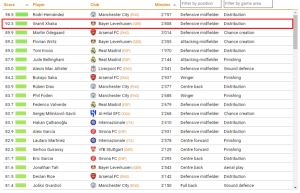 Rezultati i ndikimit u llogarit duke marrë parasysh paraqitjet e lojtarëve në gjashtë fusha të lojës, minutat e ligës vendase dhe rezultatet.