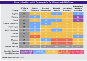 “Ndër 10 vendet me rezultatet më të larta të GOI në vendet në zhvillim në Europë, Moldavia dhe Shqipëria janë të vetmet vende, që bien nën mesataren në dy kategori: Shërbimet Financiare dhe Kuadri Institucional. Në të dyja vendet, kuadret Institucionale pengohen veçanërisht nga performanca e dobët e tyre, në nënkategorinë e Qeverisjes Publike, e cila bie dy devijime standarde, nën standardin”, thuhet në indeks.