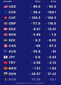 Në tregun e këmbimit valutor shqiptar sot euro do të blihet me 99.4 lekë dhe do të shitet me 100.1 lekë, ndërsa një dollar do blihet me 89.6 lekë dhe do shitet me 90.6 lekë.