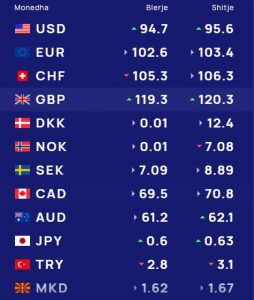 Paundi britanik do blihet me 119.3 lekë dhe do shitet me 120.3 lekë, ndërkohë që franga zvicerane do blihet me 105.3 lekë dhe do shitet me 106.3.