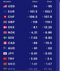 Në tregun e këmbimit valutor shqiptar sot një euro do të blihet me 101.3 lekë dhe do të shitet me 102.1 lekë, ndërsa dollari amerikan do blihet me 94 lekë dhe do të shitet me 95 lekë.