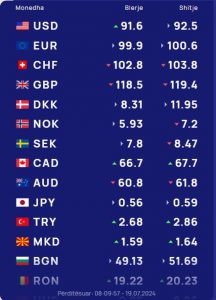 Në tregun e këmbimit valutor shqiptar sot euro do të blihet me 99.9 lekë dhe do të shitet me 100.6 lekë, ndërsa një dollar do blihet me 91.6 lekë dhe do shitet me 92.5 lekë