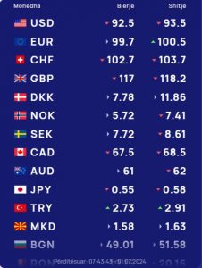Franga zvicerane do blihet me 102.7 lekë dhe do shitet me 103.7 lekë, ndërsa paundi britanik do blihet me 117 lekë dhe do shitet me 118.2 lekë.