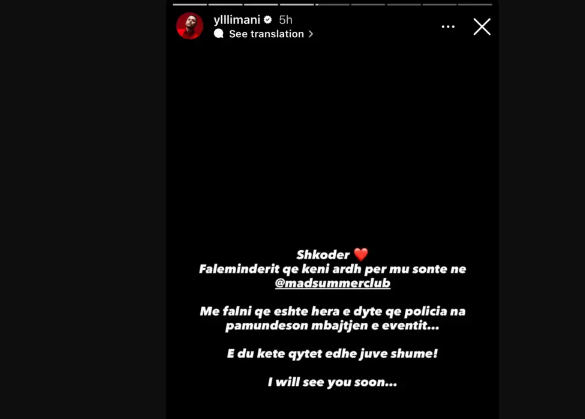 “Shkodër Faleminderit që keni ardh për mu sonte… Më falni që është hera e dytë që policia na pamundëson mbajtjen e eventit. E du këtë qytet edhe juve shumë! I will see you soon,”-ishte ky njoftimi që Yll Limani ka bërë orët e para të mëngjesit nëpërmjet një postimi të shpërndarë në llogarinë e tij personale të Instagramit.