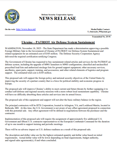 @StateDept has approved a possible Foreign Military Sale to Ukraine of PATRIOT Air Defense System Sustainment and related equipment for an estimated cost of $105 million.