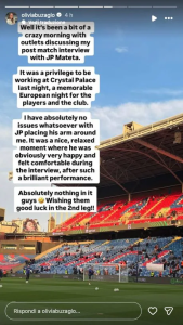 Mateta në fakt nuk duket se ka bërë asgjë të çuditshme. Ndoshta ishte mësuar ta shihte gazetaren në fushë dhe sigurisht, pas shumë ndeshjesh, ekziston edhe një farë familjariteti që në fakt nuk do ta kishte shqetësuar atë. Olivia Buzaglo në fakt e rrëzon menjëherë çështjen duke shpjeguar se nuk kishte vërtet asgjë të keqe në atë lloj përqafimi nga ana e Mateta: “Epo, ka qenë një mëngjes pak i çmendur me mediat që kanë folur për intervistën time pas ndeshjes me JP Mateta – shkruan ajo -. Ishte një privilegj të punoja te Crystal Palace mbrëmë, një mbrëmje europiane e paharrueshme për lojtarët dhe për klubin”.