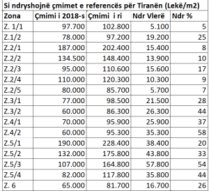 Konkretisht rritje e çmimeve të referencës së apartamenteve për 32 zonat kadastarale të Tiranës varion nga vlera 5,100 lekë për metër katror të zonës kadastrale 1/1 (ku përfshin zonat Kinema “Ali Demi”, Fusha e Sportit, fshati Shkozë, Depo e Ujit; 1/2 Poligrafiku, Shkoza, Autotraktorët, fshati Shkozë, LanaBregas, Linzë, Sauk) deri në 57,800 lekë për metër katror që është rritja më e lartë në vlerë e çmimeve të referencës për zonën kadastrale 5/3 në Tiranë që përkon me zonat si: Kopshti Botanik, rruga “Komuna e Parisit” Liqeni artificial.
